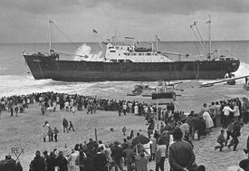 THE EPIC OF THE RUBEN. Panamanian cargo ship RUBEN, launched as DELIA in 1951 by Weser shipyards in Bremen, has left Bayonne in the evening of November 29, 1976. She is en route northbound, towards Dunkirk. The vessel is off Lacanau, when the storm raises, late in the evening, on November 30th. During the night, the ship suffers an the engine breakdown and begins to drift. January 1st, the Finnish master of the RUBEN, 72 years old, sends his first distress call. The German high sea tug PACIFIC is not far but she can't come to rescue the Panamanian cargo ship, because at the same time, she is trying to tow the greek tanker ship APOLLONIAN WAVE. On december 3, the RUBEN touches the ground several times not far from the beach in Mimizan where the VIRGO and the APOLLONIAN WAVE grounded, the previous day, but the crew miracullously manages to start the engine again. The ship saves herself and her master decides to go head south up to Pasajes to repair. The rudder blade has been damaged when the vessel touched the ground and the RUBEN is not longer really under control. On December 4, the Master gives order to drop the anchor off the beach "des Bourdaines" in Seignosse, to wait for the assistance of tugs. In the evening of December 5, the RUBEN suffers a new gale. Pushed by currents, the ship drags her anchors and the waves throw her on the beach in Seignosse le Penon. We are December 5, 1976, it is 11 p.m. The rescue is organized from the beach all night long and at 8 a.m in the following morning, thanks to the low tide, the crew is finaly evacuated from the vessel. The RUBEN is in a good condition, so her lebanese owner decides to try to save her. During January 1977, several attempts to refloat her with the Dutch tug BARRACUDA fail and soon, the RUBEN is auctioned. In March, Mr. Voisin, a French contractor from Coex, in the Vendee region buys the ship and swears he will save her from her prison of sand. After many efforts and several attempts, the RUBEN is finally refloated on August 1st 1977 and she arrives in Bayonne in tow, Bayonne from where she had left, 8 months before. There she will stay one year long. The bill of the salvage operation and necessary repairs is too expensive. Mr Voisin, can't pay. He tries to sell her without success. The RUBEN is seized by authorities and soon sold for scrap. She will be broken up in July 1978 in Zumaia, Spain. |