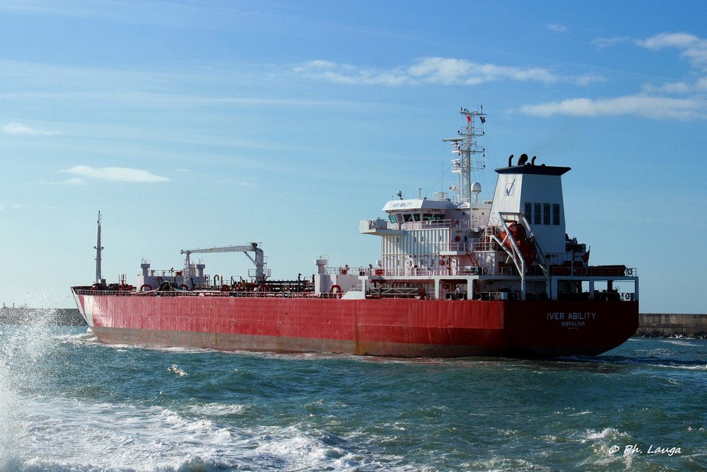Photos 1 to 3 : Photos 5 to 7 : IVER ABILITY, leaving Bayonne on 03-02-2015, Photos 4 to 6, leaving Bayonne on 16-04-18 with a new colour of hull